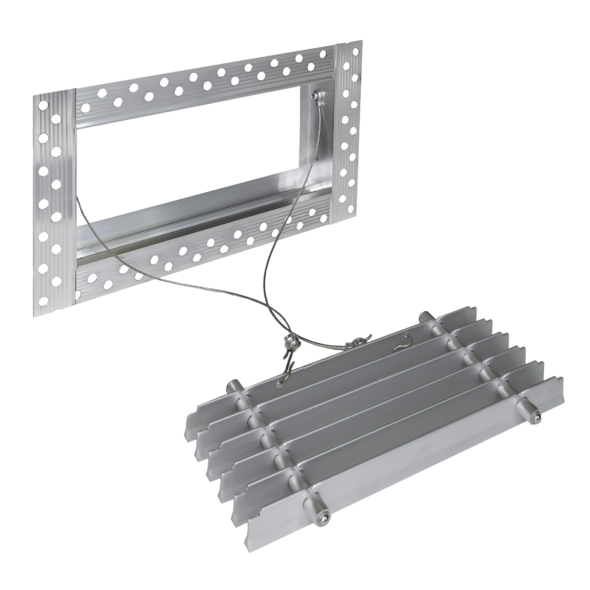 Данная решетка подходит для монтажа на любую поверхность под финишную отделку. Рамка и экран изготовлены из алюминия, опора экрана - из оцинкованной стали. Рама оснащена «полкой» 1,9 мм и рифлеными краями для большей адгезии финишного материала – шпатлевки, цемента. Решетка имеет съемную центральную часть с фиксированным углом наклона ламелей 0°. Она крепится к корпусу прочными металлическими тросиками, легко снимается для очистки и удобного обслуживания.