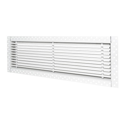 Данная решетка подходит для монтажа на любую поверхность под финишную отделку. Рамка и экран изготовлены из алюминия, опора экрана - из оцинкованной стали. Рама оснащена «полкой» 1,9 мм и рифлеными краями для большей адгезии финишного материала – шпатлевки, цемента. Решетка имеет съемную центральную часть с фиксированным углом наклона ламелей 0°. Она крепится к корпусу прочными металлическими тросиками, легко снимается для очистки и удобного обслуживания.