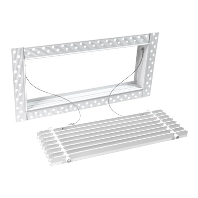 Данная решетка подходит для монтажа на любую поверхность под финишную отделку. Рама оснащена «полкой» 1,9 мм и рифлеными краями для большей адгезии финишного материала – шпатлевки, цемента. Решетка имеет съемную центральную часть с декоративным экраном. Она крепится к корпусу прочными металлическими тросиками, легко снимается для очистки и удобного обслуживания.