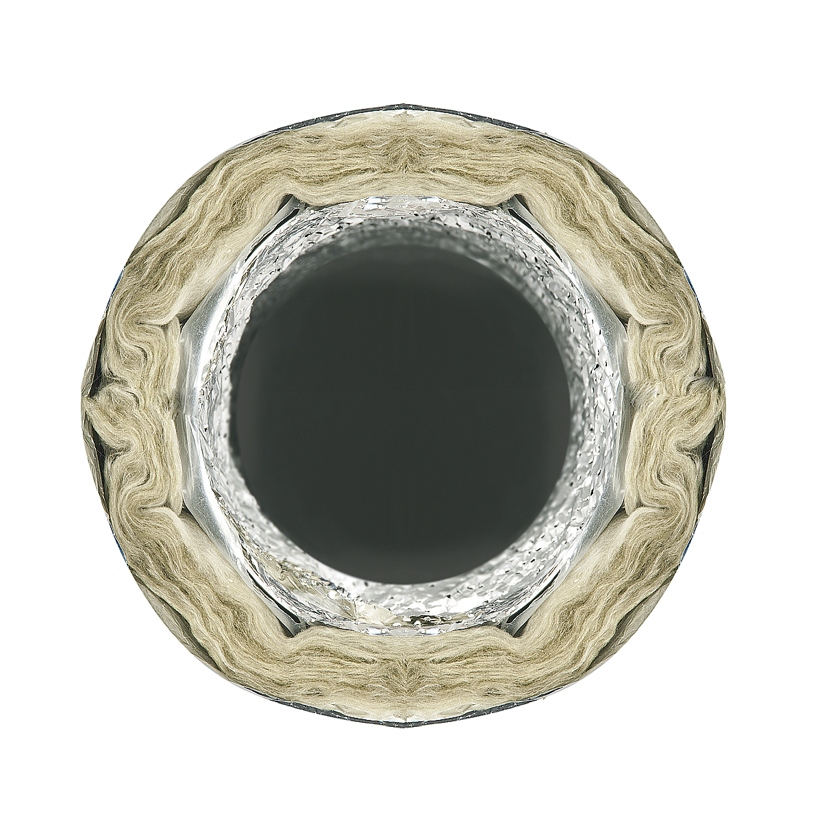 Шумоизоляционный слой без стыков, волокно имеет равномерный нахлест. При монтаже он не раскрывается, не образуются незащищенные зоны. Как следствие не ухудшается качество звукоизоляции.Наружный слой из алюминия, ламинированного полиэстером, надежно защищает изоляционный материал и внутренний воздуховод от деформации, нарушения целостности.